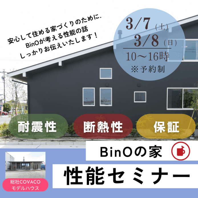 BinOの家 【性能セミナー】開催します! 家族を守る家づくりのために、 BinOが取り組んでいる「性能」について 分かりやすくお伝えいたします。 「…