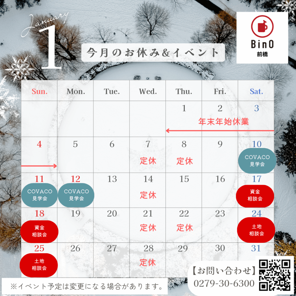 お知らせ NEW 2025.12.26 1月定休&イベントお知らせ △▲△イベント予定△▲△ ■1/10(土)~12(月) 新春!COVACOモデルハウス見学会 ■1/17(土)・18(日) 資金相談会 ■1/24(土)・25(日) 土地に関するなんでも相談会 【年末年始休業期間】 2025/12/27(土)~2026/1/4(日) ※1/5(月)より通常営業いたします。 詳細・ご予約はイベントページへ随時更新いたします。 ※イベント内容は都合により変更となる場合もございます。 最新情報はイベントページ・instagramをご覧ください。
